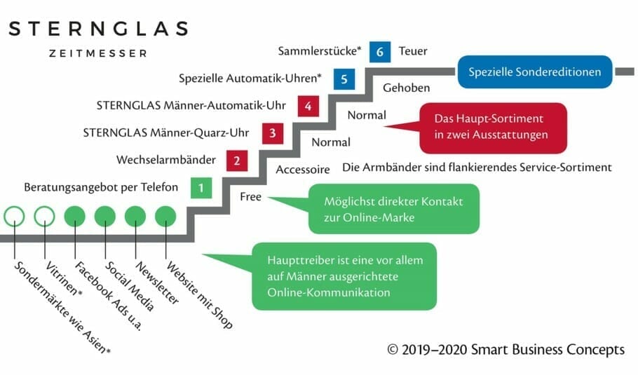 Das Beispiel stammt aus dem Buch „Business Model Produkt-Treppe“. Schön zu sehen: Auf der Stufe 3 stehen die Quarz-Uhren, der Verkaufsschlager bei STERNGLAS. Die aufwendigeren und teureren Automatik-Uhren liegen eine Stufe darüber auf der 4. Editionen und Sammlerstücke schließen die Treppe oben ab (Superuser), nach unten ist die Treppe geöffnet durch die Wechselarmbänder und ein kostenloses „Beratungsprodukt“, das Angebot einer Telefonberatung (Reichweitenprodukt).